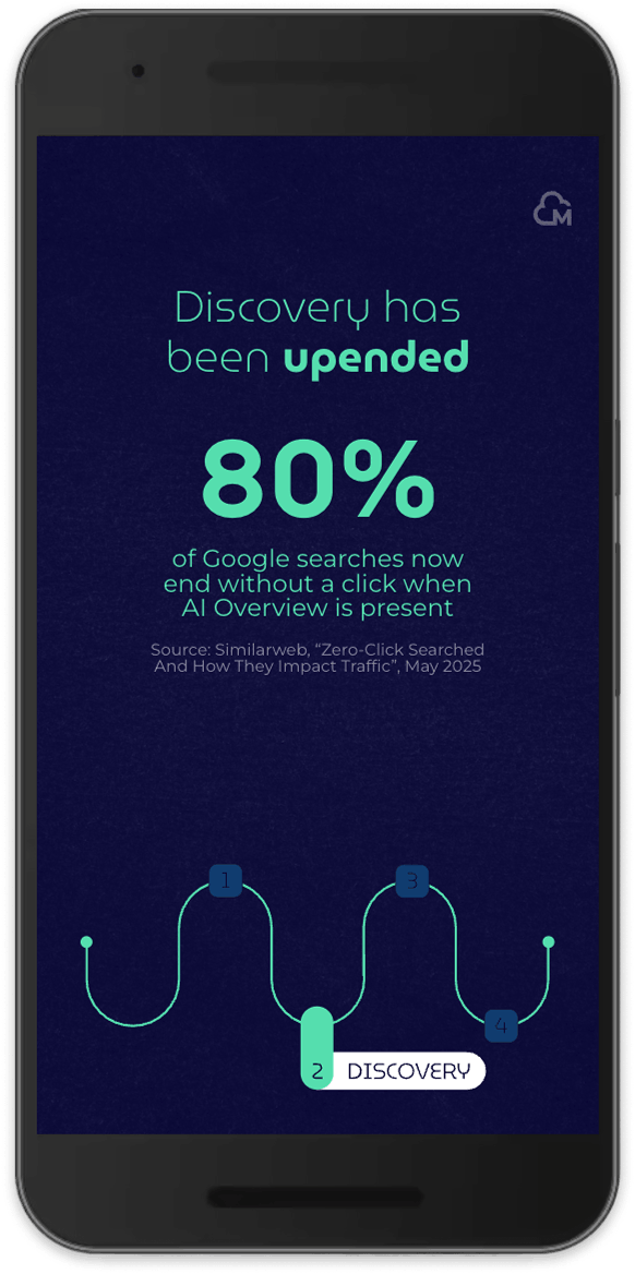 The scrollytelling starts with an introduction in how consumer journeys change in the era of AI. I personally find this survey insight especially interesting and a bit alarming: 80% of Google searches end without a click when an AI overview is present.